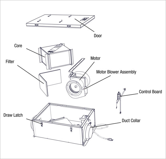 Renewaire EV130 is the most popular residential ERV in the market. This unit is ideal for homes up to 2,700 sqft. It comes with a 10-year warranty on the Energy Exchange Core. The warranty on all the other components is 2 years. The only maintenance required on the unit is to replace the filters every month. Filters are very easy to replace, just open the unit, pull them out and replace them with new ones. This ensures that your unit will operate at its peak performance and trouble free. The unit is very quiet and consumes less than 1 watt standby power consumption. Installation is easy since there is no water condensate line in the unit to worry about. The reason is because Renewaire's patented energy recovery core lets temperature and humidity to transfer from one airstream to the other. You can mount the unit in any configuration imaginable; there are no restrictions. EV130 - Overview